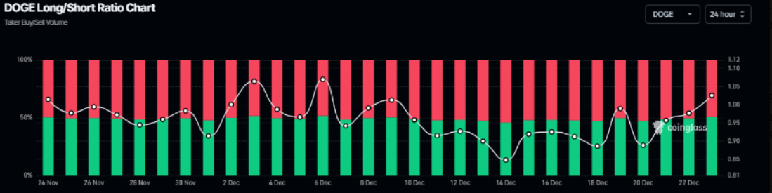 Trên thị trường phái sinh, theo Coinglass, tỷ lệ long/short của DOGE đạt 1,02 vào thứ Ba, tiệm cận mức cao nhất trong tháng. Việc tỷ lệ này vượt ngưỡng 1 phản ánh tâm lý lạc quan ngày càng gia tăng, khi số lượng trader đặt cược vào kịch bản giá tăng đang áp đảo bên bán.