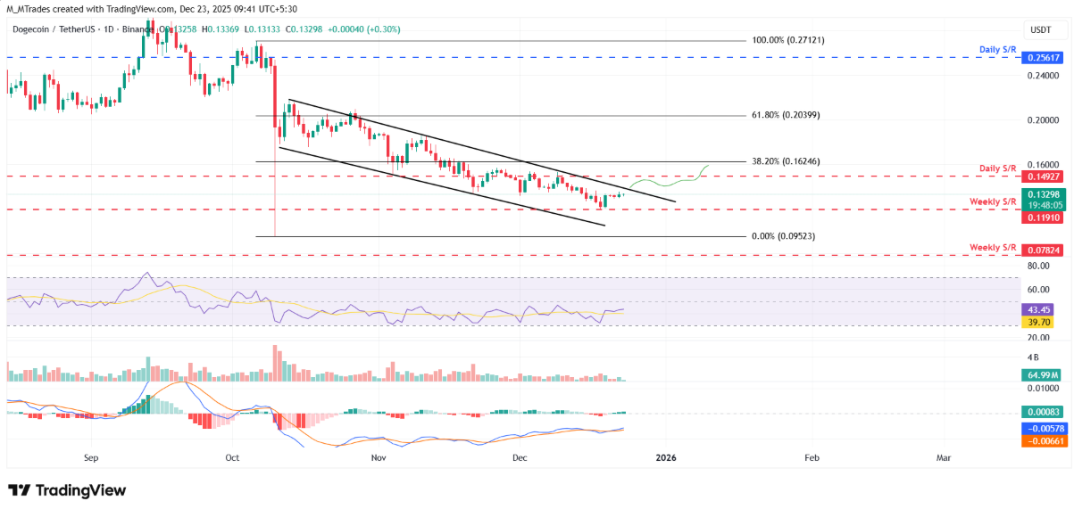 Trong trường hợp DOGE bứt phá dứt khoát mô hình cái nêm giảm — vốn thường được xem là tín hiệu ủng hộ xu hướng tăng — giá có thể mở rộng đà phục hồi lên vùng kháng cự ngày tại 0,14 USD. Nếu lực mua đủ mạnh giúp giá đóng cửa ổn định trên ngưỡng này, DOGE nhiều khả năng sẽ tiếp tục hướng tới mốc Fibonacci thoái lui 38,2% tại 0,16 USD.