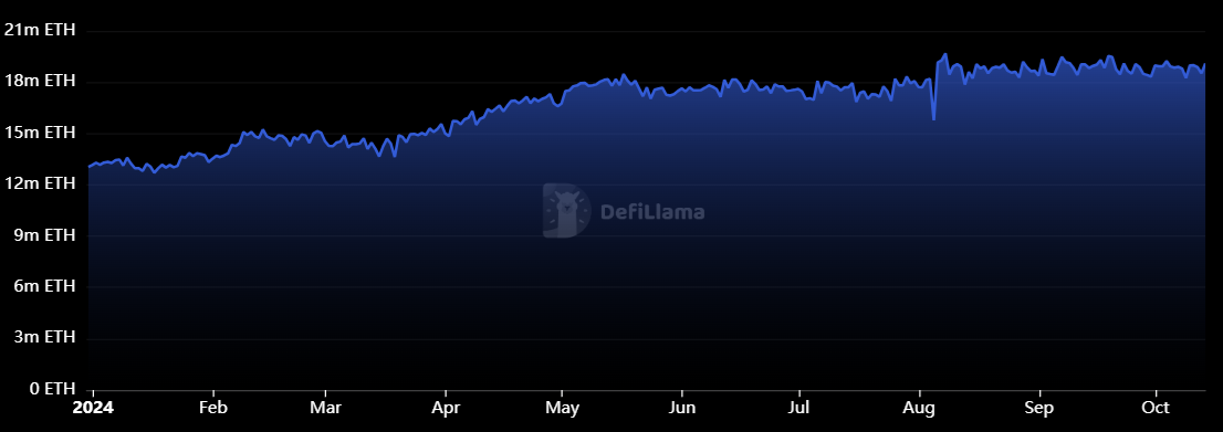 Theo dữ liệu từ DefiLlama, TVL của Ethereum đã duy trì ở mức khoảng 19 triệu ETH trong hai tháng qua. Điều này không quá đáng lo ngại, vì với $48 tỷ giá trị on-chain, Ethereum vẫn chiếm 55% thị phần trong thị trường tiền mã hóa. Để so sánh, TVL của BNB Chain cũng duy trì ổn định ở mức khoảng 8,1 triệu BNB trong cùng kỳ.