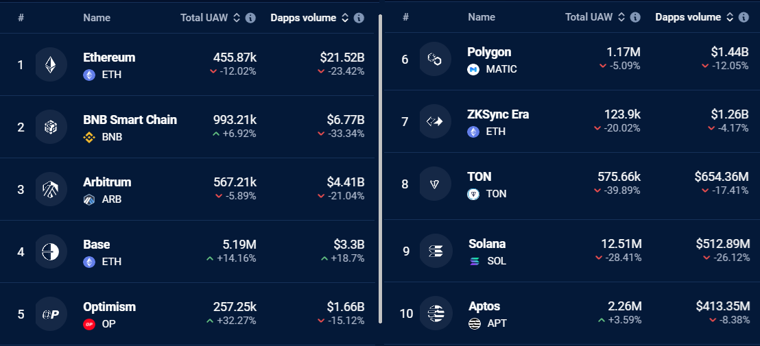 Khối lượng giao dịch DApp của Ethereum trong 7 ngày qua giảm xuống còn $21,5 tỷ. Tuy nhiên, các đối thủ như BNB Chain và Solana cũng gặp phải tình trạng tương tự, với khối lượng giảm lần lượt 33% và 26% so với tuần trước. Mặc dù hiệu suất kém, dữ liệu này không chỉ ra một sự sụt giảm lớn sắp xảy ra với giá Ether.