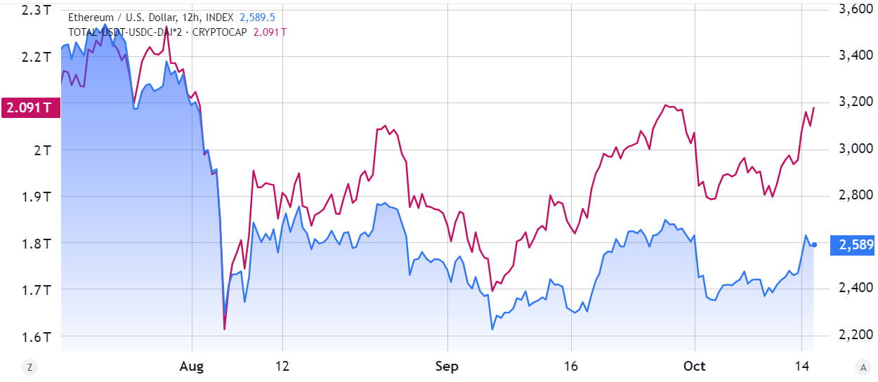Mặc dù nhiều yếu tố đã tác động tiêu cực đến giá Ether từ giữa tháng 7, nhưng điều đáng chú ý là tổng vốn hóa thị trường tiền mã hóa hầu như không biến động nhiều trong cùng kỳ ba tháng.