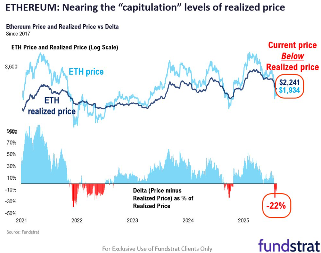 Những phát biểu của Lee được đưa ra không lâu sau báo cáo của nhà phân tích Sean Farrell thuộc Fundstrat, trong đó cho rằng ETH có thể đang tiến sát vùng đáy chu kỳ. Dựa trên chỉ số giá thực hiện (realized price) on-chain, ETH hiện giao dịch thấp hơn khoảng 22% so với chi phí vốn trung bình của nhà đầu tư – mức không quá chênh lệch so với các vùng đáy từng ghi nhận vào năm 2022 và 2025.