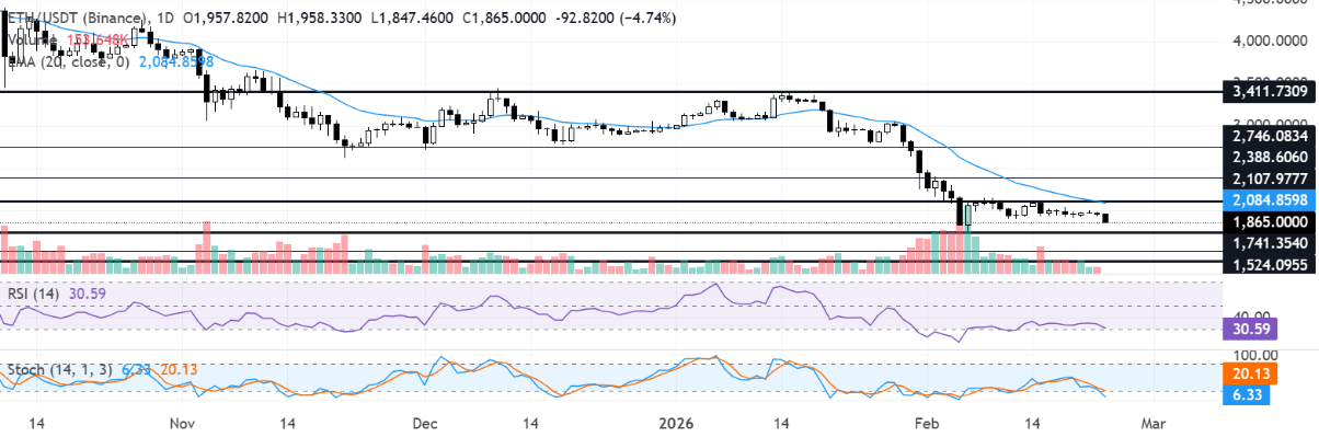 Trên khung thời gian ngày, ETH hiện giao dịch quanh mốc 1.896 USD. Đường trung bình động hàm mũ (EMA) 20 ngày tại 2.087 USD tiếp tục hướng xuống, phản ánh xu hướng ngắn hạn vẫn mang màu sắc tiêu cực khi giá chưa thể lấy lại mốc này.