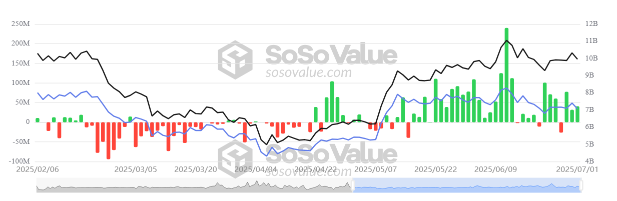 Thêm vào đó, theo dữ liệu từ Sosovalue, dòng tiền ròng vào các quỹ ETF Ethereum giao ngay tại Mỹ, mặc dù vẫn duy trì tích cực, nhưng đang có dấu hiệu chậm lại. Dòng tiền này đã giảm mạnh từ hơn 240 triệu đô la vào giữa tháng 6 xuống chỉ còn 40 triệu đô la vào đầu tháng 7. Điều này có thể là tín hiệu cho thấy đà mua vào đã giảm bớt, và những điều chỉnh giá có thể sẽ xảy ra trong ngắn hạn.