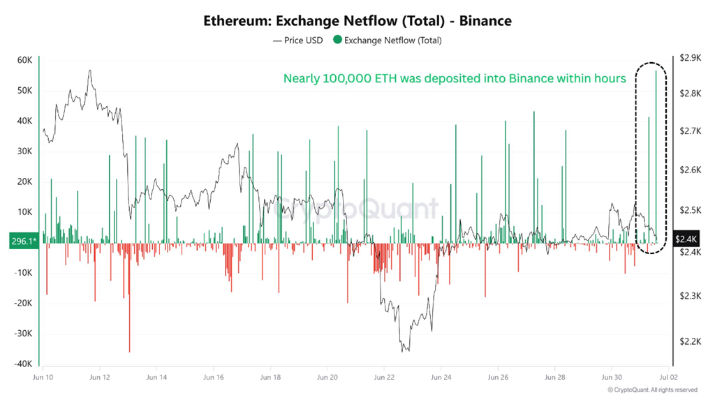 Tuy nhiên, mặc dù có sự phục hồi ấn tượng, các nhà phân tích đang theo dõi chặt chẽ dòng tiền vào Ethereum, đặc biệt là vào các sàn giao dịch. Theo dữ liệu từ CryptoQuant, vào ngày 1 tháng 7 năm 2025, gần 100.000 ETH, trị giá khoảng 250 triệu đô la, đã được gửi vào Binance. Đây là mức cao nhất trong tháng qua, cho thấy sự quan tâm lớn từ các nhà đầu tư, nhưng cũng tiềm ẩn nguy cơ điều chỉnh giá.