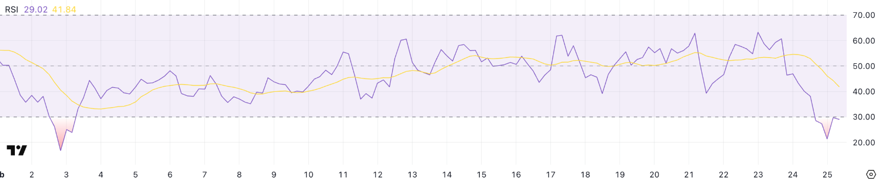 Chỉ số sức mạnh tương đối (RSI) của ETH hiện ở mức 29 sau khi giảm xuống 21,3 vài giờ trước. Đây là lần đầu tiên kể từ ngày 3 tháng 2, ETH rơi vào vùng quá bán, phản ánh áp lực bán mạnh.