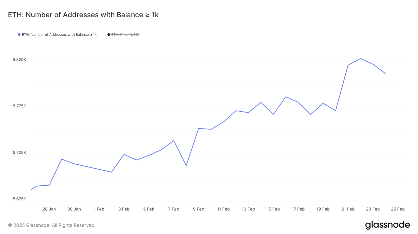 Số lượng cá voi ETH – các địa chỉ nắm giữ ít nhất 1.000 ETH – đã tăng ổn định trong tháng qua, đạt đỉnh 5.828 vào ngày 22 tháng 2, mức cao nhất kể từ tháng 2 năm 2024. Tuy nhiên, xu hướng này gần đây đã đảo chiều, với số lượng cá voi giảm nhẹ xuống còn 5.812.