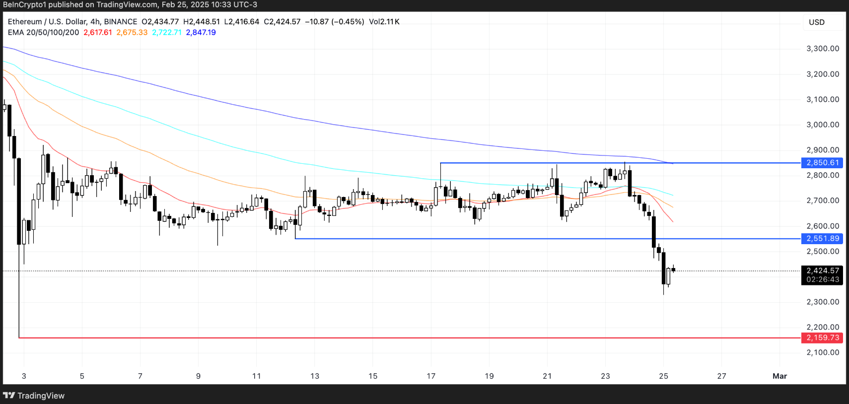 Sau khi xuất hiện mô hình này, giá Ethereum đã giảm xuống dưới $2.500, phản ánh áp lực bán gia tăng. Nếu xu hướng giảm tiếp tục, ETH có thể giảm xuống $2.150, đánh dấu lần đầu tiên xuống dưới $2.200 kể từ tháng 12 năm 2023. Giao cắt tử thần cho thấy động lực giảm giá vẫn đang chiếm ưu thế, và thị trường có thể tiếp tục chịu áp lực đi xuống.