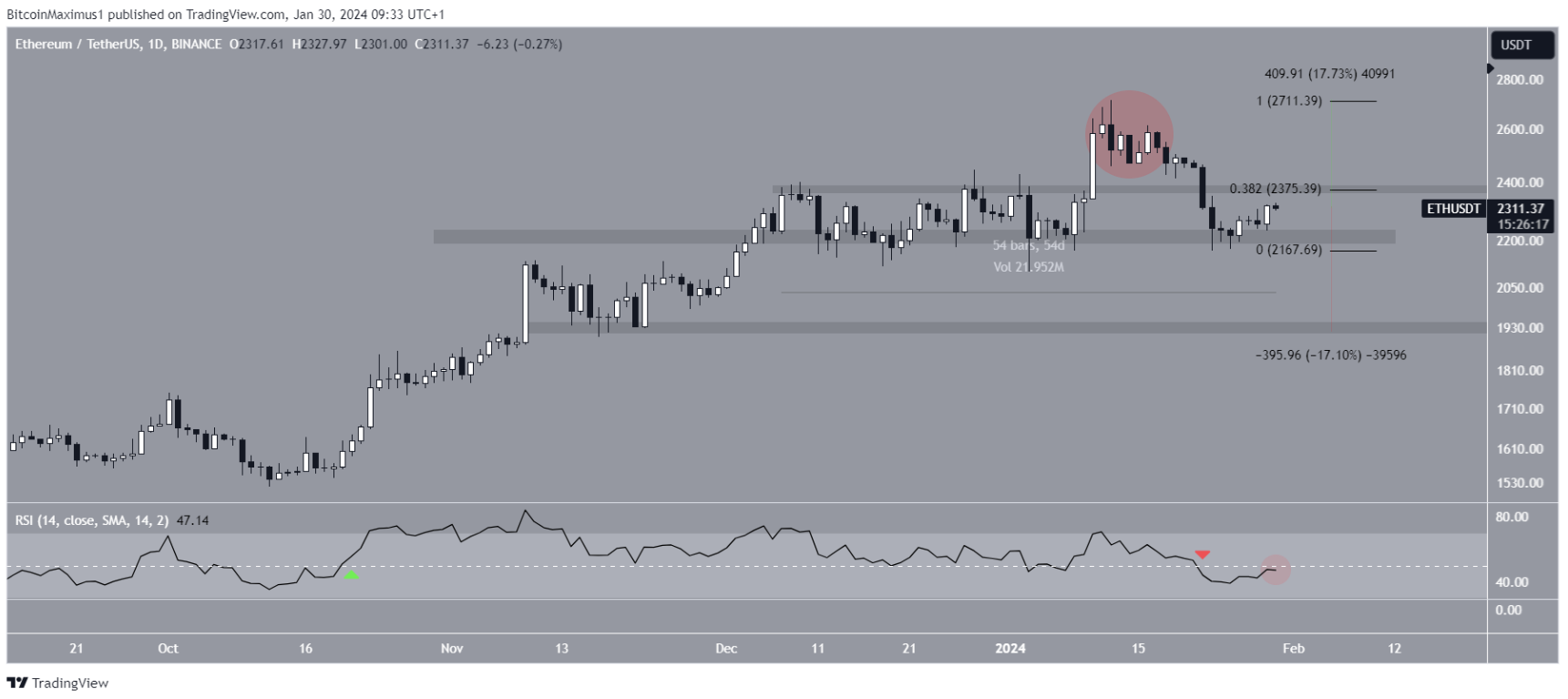 Sau khi ETH bắt đầu chuyển động đi lên từ mức $1.500 vào tháng 10 năm 2023, chỉ số RSI đã tăng lên trên 50 (biểu tượng màu xanh lá cây). Nó duy trì trên đó cho đến khi giá giảm trở lại phạm vi vào ngày 22 tháng 1 năm 2024 (biểu tượng màu đỏ).