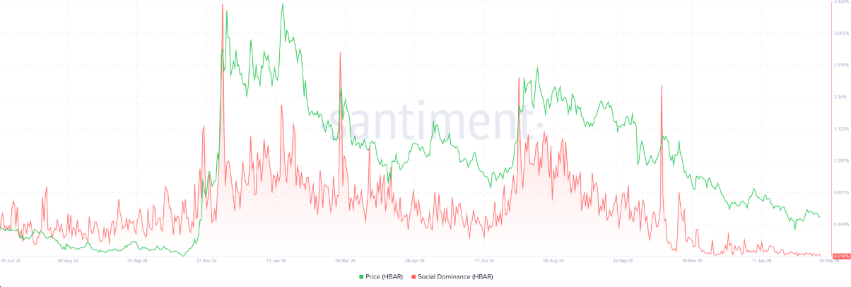 Dữ liệu Social Dominance từ Santiment đang củng cố thêm kịch bản tiêu cực cho Hedera. Chỉ số này phản ánh tỷ trọng các cuộc thảo luận liên quan đến HBAR trên truyền thông tiền điện tử. Kể từ cuối tháng 12, Social Dominance đã bước vào xu hướng suy giảm rõ rệt và tiếp tục lao dốc trong tháng 2, chạm mức chỉ 0,018% vào thứ Ba. Diễn biến này cho thấy sự quan tâm của thị trường đang nguội dần, đồng thời phản ánh tâm lý nhà đầu tư HBAR ngày càng kém tích cực.