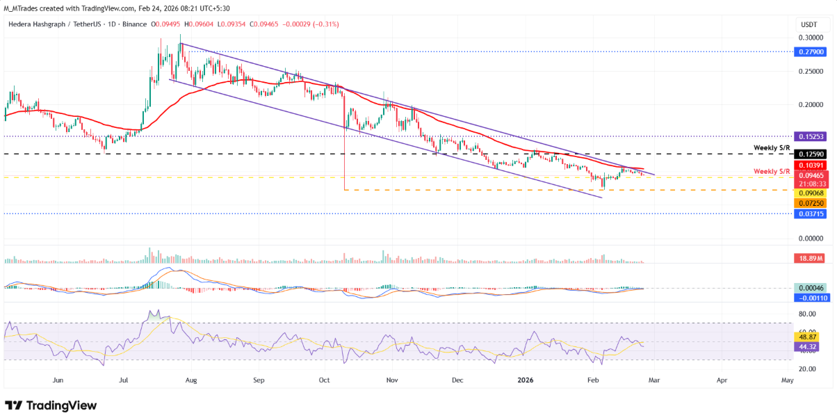 Giá Hedera đã không thể vượt qua vùng kháng cự quanh đường trung bình động hàm mũ (EMA) 50 ngày tại 0,103 USD vào ngày 14/2, qua đó quay đầu giảm mạnh khoảng 8,5% cho đến thứ Hai. Đáng chú ý, đường EMA 50 ngày gần như trùng khớp với đường xu hướng phía trên của mô hình cái nêm giảm — được hình thành từ việc nối các đỉnh và đáy kể từ cuối tháng 6 — khiến khu vực này trở thành rào cản kỹ thuật then chốt. Tại thời điểm ghi nhận vào thứ Ba, HBAR đang dao động quanh mốc 0,094 USD.