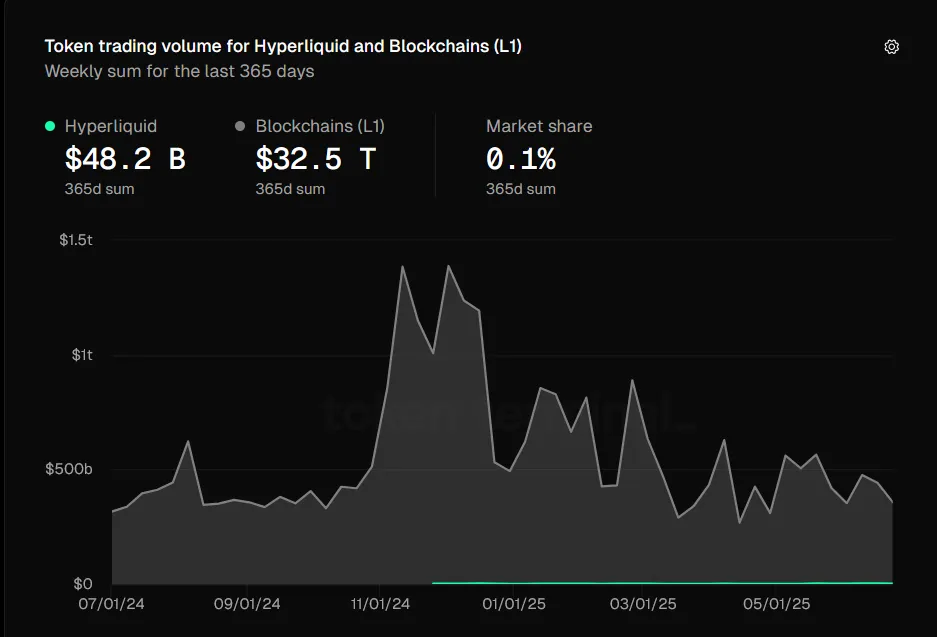 Mặc dù có những chuyển biến tích cực, Hyperliquid vẫn chỉ chiếm một tỷ lệ rất nhỏ trong thị trường DeFi, ước tính chỉ khoảng 0,1% tổng thị trường. Đồng thời, nền tảng này hiện đang xếp hạng thứ 31 trong số các DEX theo khối lượng token. Điều này cho thấy dù có sự tăng trưởng ấn tượng về khối lượng giao dịch, nhưng Hyperliquid vẫn phải đối mặt với nhiều thách thức trong việc mở rộng thị phần so với các đối thủ lớn trong lĩnh vực DeFi.