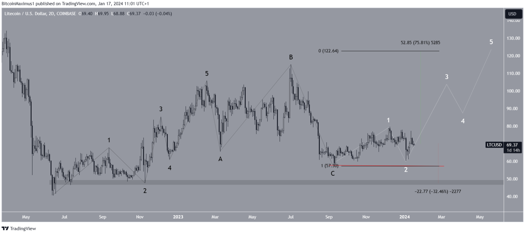 Theo kịch bản này, Litecoin đã bắt đầu một chuyển động đi lên khác (màu trắng) vào tháng 9 năm 2023. LTC được dự đoán sẽ tăng 75% nếu các chuyển động đi lên này có cùng độ dài, đạt mức kháng cự tiếp theo ở $122.