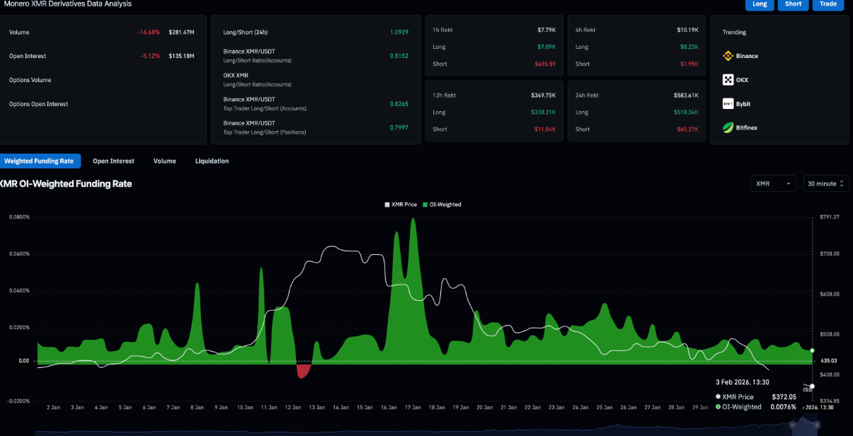 Trên thị trường phái sinh, tín hiệu suy yếu của lực cầu từ nhà đầu tư cá nhân vẫn khá rõ rệt. Thống kê từ CoinGlass cho thấy Hợp đồng mở (OI) của hợp đồng tương lai XMR giảm 5,12% trong 24 giờ qua, xuống còn 135,18 triệu USD, phản ánh quy mô vị thế đang được thu hẹp đáng kể.