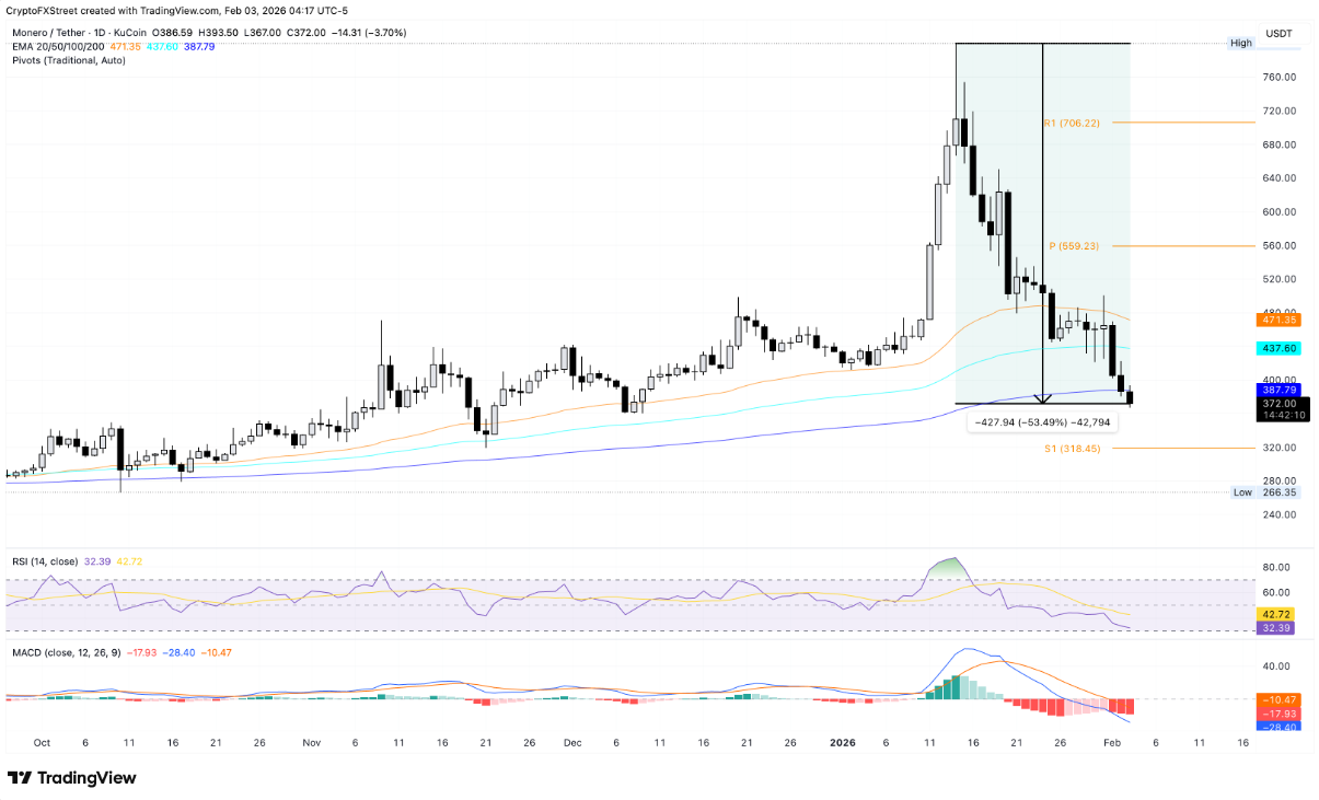 Monero đã lao dốc mạnh từ đỉnh 800 USD thiết lập ngày 14/1, xuyên thủng mốc tâm lý 400 USD và ghi nhận mức sụt giảm hơn 50%. Tính đến thời điểm viết bài vào thứ Tư, XMR mất thêm 4% trong ngày, giao dịch dưới đường EMA 200 ngày quanh 387 USD, đồng thời “bốc hơi” khoảng 20% giá trị chỉ trong vòng ba phiên gần nhất.