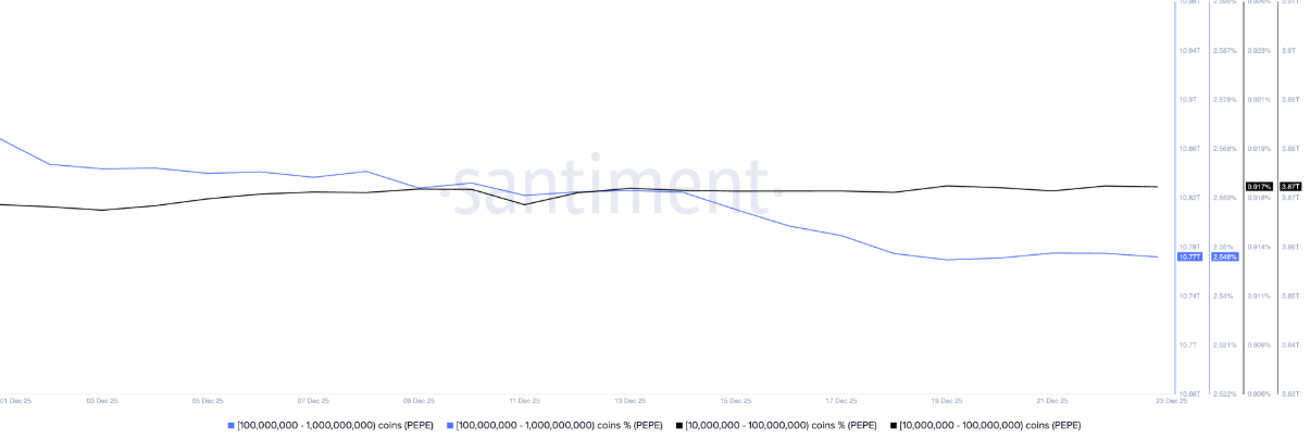 Các nhà đầu tư sở hữu ví lớn (whales) đang từng bước thu hẹp vị thế với PEPE, qua đó gia tăng áp lực nguồn cung và phát đi tín hiệu rõ ràng về sự suy yếu trong niềm tin thị trường. Theo dữ liệu từ Santiment, nhóm ví nắm giữ từ 100 triệu đến 1 tỷ PEPE hiện chỉ còn sở hữu 10,77 nghìn tỷ token, tương đương 2,54% nguồn cung lưu hành, giảm so với 10,87 nghìn tỷ PEPE (2,57%) ghi nhận vào ngày 1/12.