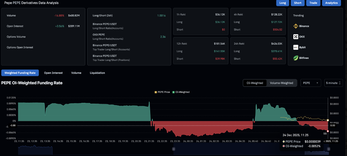 Trên thị trường phái sinh, số liệu từ CoinGlass cho thấy hợp đồng mở của hợp đồng tương lai PEPE đã tăng 3,56% trong 24 giờ qua, đạt 209,11 triệu USD. Diễn biến này cho thấy các trader đang rót thêm vốn và chấp nhận mức độ rủi ro cao hơn trong ngắn hạn.