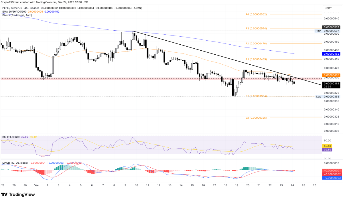 PEPE đang duy trì đà đảo chiều giảm sau khi bị từ chối tại đường kháng cự ngắn hạn, được hình thành bằng cách nối các đỉnh ngày 9/12 và 22/12 trên biểu đồ logarit khung 4 giờ, quanh vùng 0,00000400 USD. Tại thời điểm ghi nhận, PEPE giảm khoảng 2% trong phiên thứ Tư và tiếp tục chịu áp lực điều chỉnh, với mục tiêu gần nhất là đáy ngày 18/12 tại 0,00000363 USD — khu vực trùng khớp với mốc Pivot S1 ở 0,00000364 USD.
