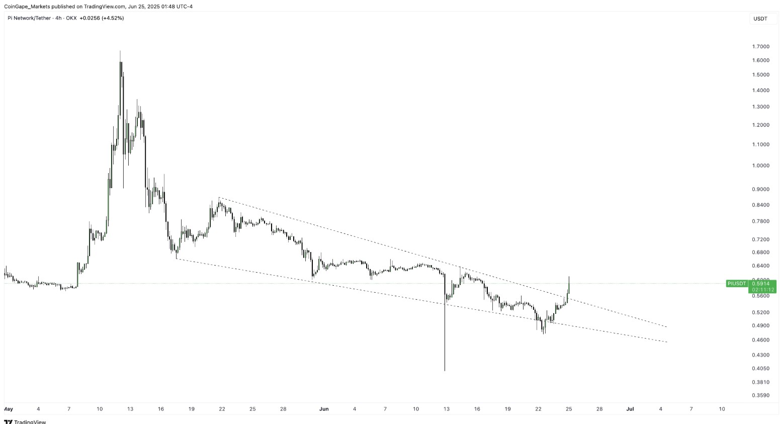Trong ba ngày qua, giá Pi Coin đã di chuyển từ mức thấp nhất là 0,47 đô la lên mức cao nhất trong tuần là 0,63 đô la. Đặc biệt, đợt tăng giá này đã giúp đồng Pi phá vỡ ngưỡng kháng cự trên của mô hình nêm giảm, một tín hiệu mạnh mẽ cho thấy xu hướng giảm đang yếu đi và phe mua đang cố gắng giành lại quyền kiểm soát.
