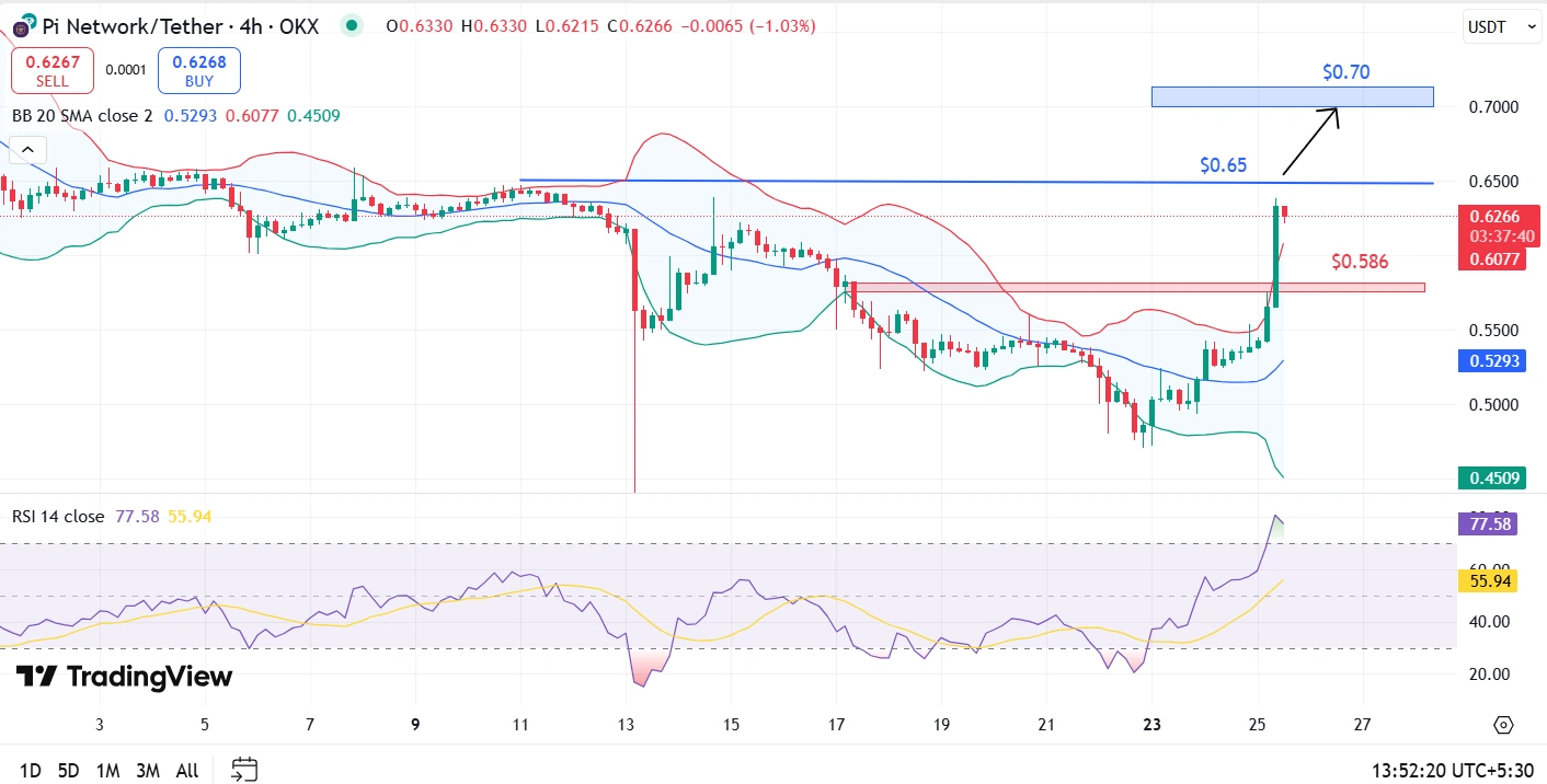 Trên biểu đồ 4 giờ, Pi Coin đã bứt phá mạnh mẽ qua dải Bollinger trên ở mức 0,58 đô la, xác nhận đà tăng mạnh mẽ. Giá PI đã chạm mức cao nhất trong 24 giờ qua là 0,63 đô la, vượt lên trên mức trung bình động 20 kỳ (SMA) là 0,52 đô la, cho thấy phe mua đang kiểm soát thị trường trong ngắn hạn.
