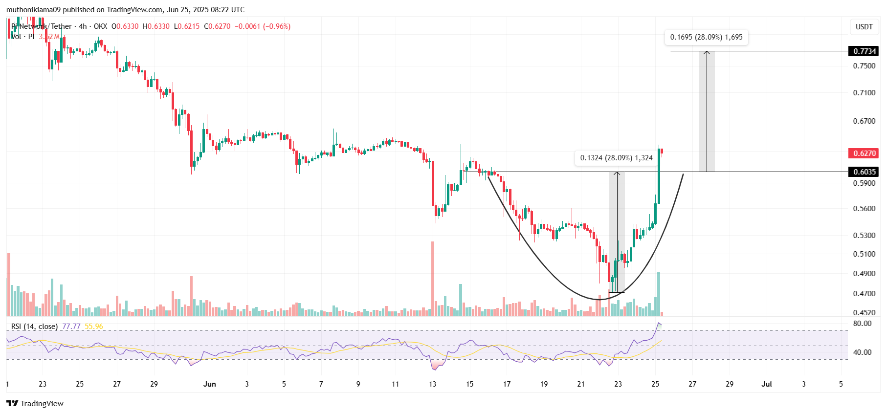 Mục tiêu tăng giá từ mô hình đáy tròn này có thể lên đến 28%, tương tự như mức dự báo từ mô hình nêm giảm, cho thấy Pi Coin có thể đạt mức 0,78 đô la trong thời gian tới.