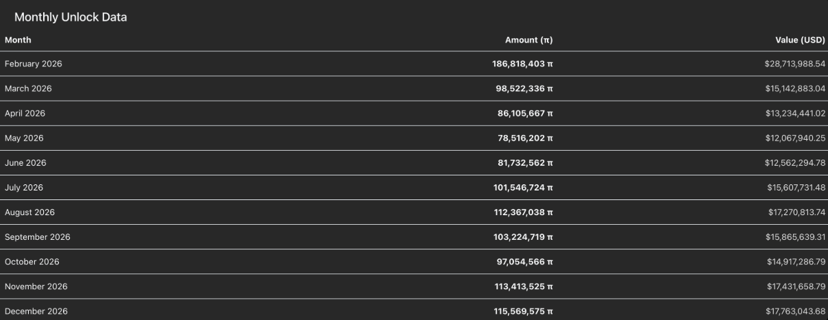Đáng chú ý, Pi Network dự kiến sẽ mở khóa thêm 186,81 triệu PI trong tháng 2 — mức phát hành theo tháng lớn nhất trong phần còn lại của năm. Việc các đợt mở khóa diễn ra dồn dập, song song với quá trình chuyển sang mainnet và lượng nắm giữ của Pi Foundation tiếp tục thu hẹp, nhiều khả năng sẽ còn khiến áp lực bán trên thị trường gia tăng trong thời gian tới.