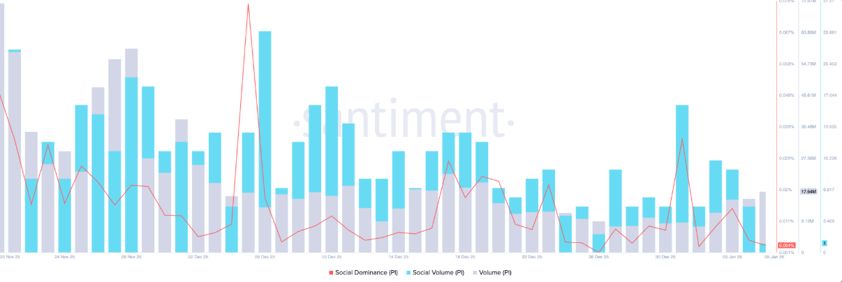 Dữ liệu từ Santiment cho thấy mức độ hiện diện của Pi Network trên truyền thông tiền điện tử đang suy giảm rõ rệt. Chỉ số thống trị xã hội đã lùi về 0,004% vào thứ Ba, phản ánh đà hạ nhiệt của các cuộc thảo luận xoay quanh dự án. Tuy vậy, trái ngược với bức tranh truyền thông trầm lắng, hoạt động giao dịch lại sôi động hơn bao giờ hết: khối lượng giao dịch Pi Network vọt lên gần 18 triệu PI trong ngày, đánh dấu mức cao nhất kể từ ngày 18/12.