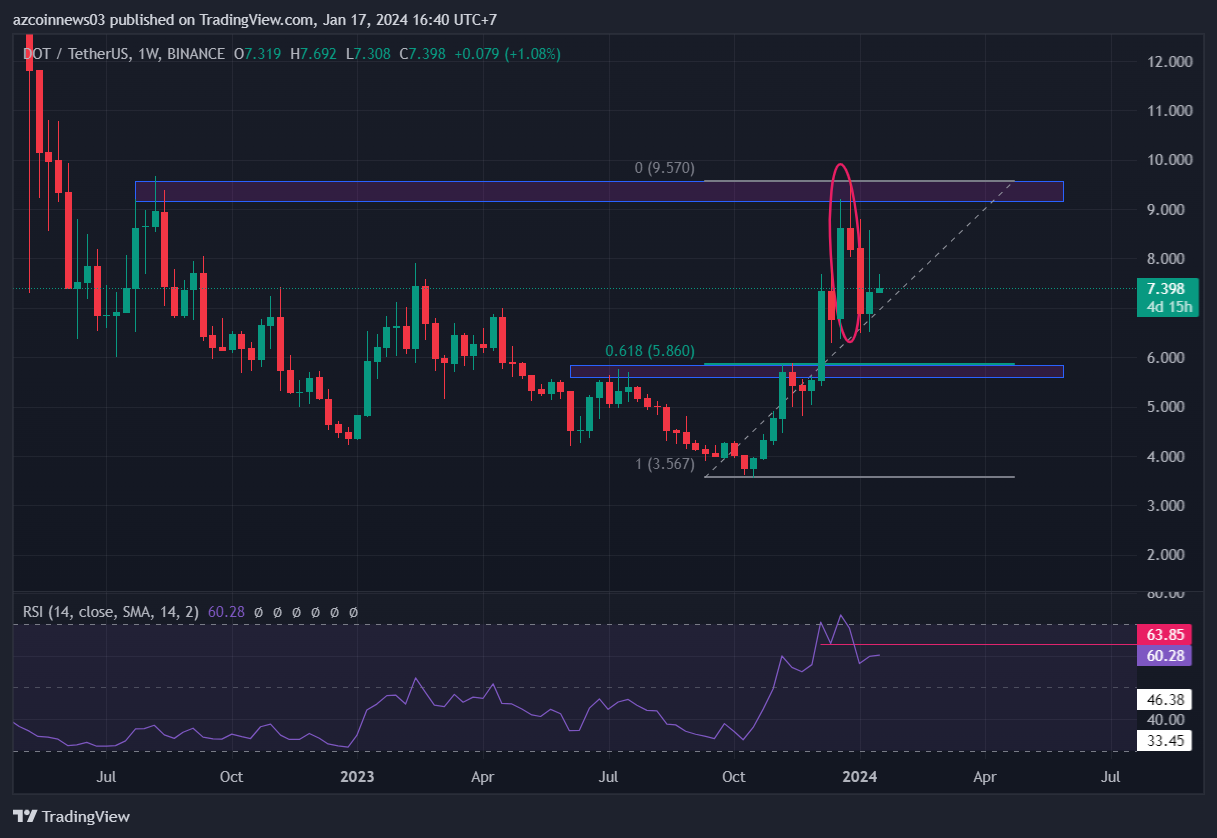 Do đó, giá DOT có khả năng sẽ tiếp tục điều chỉnh về vùng hỗ trợ quan trọng ở $5,8, được hình thành bởi vùng kháng cự ngang trước đó và mức hỗ trợ Fib thoái lui 0,618.