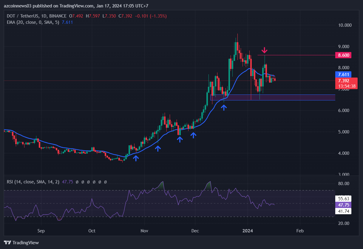 Biểu đồ hàng ngày cho thấy giá DOT đã phá vỡ xuống dưới đường EMA 20 ngày, nơi đã cung cấp hỗ trợ cho giá trong cả quá trình tăng lên (các mũi tên màu xanh).