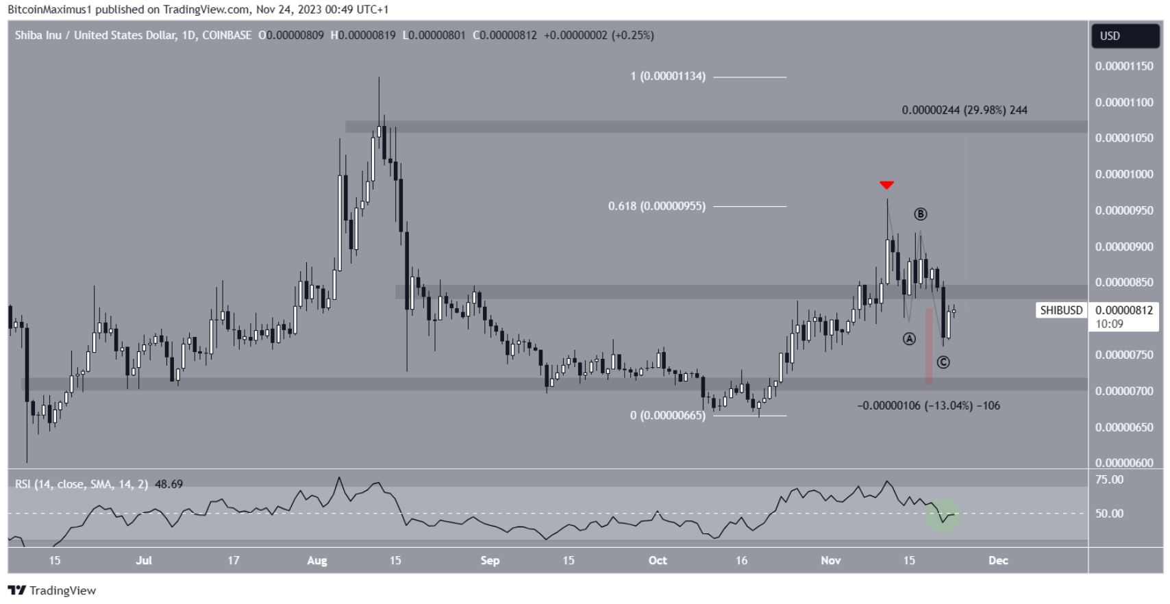 Hành động giá cho thấy giá SHIB đã bị từ chối bởi mức kháng cự Fib thoái lui 0,618 vào ngày 11 tháng 11, tạo ra bấc trên dài (biểu tượng màu đỏ) và giảm xuống. Việc giảm giá đã đưa giá SHIB xuống dưới mức $0,00000840, hiện có khả năng đóng vai trò là kháng cự.