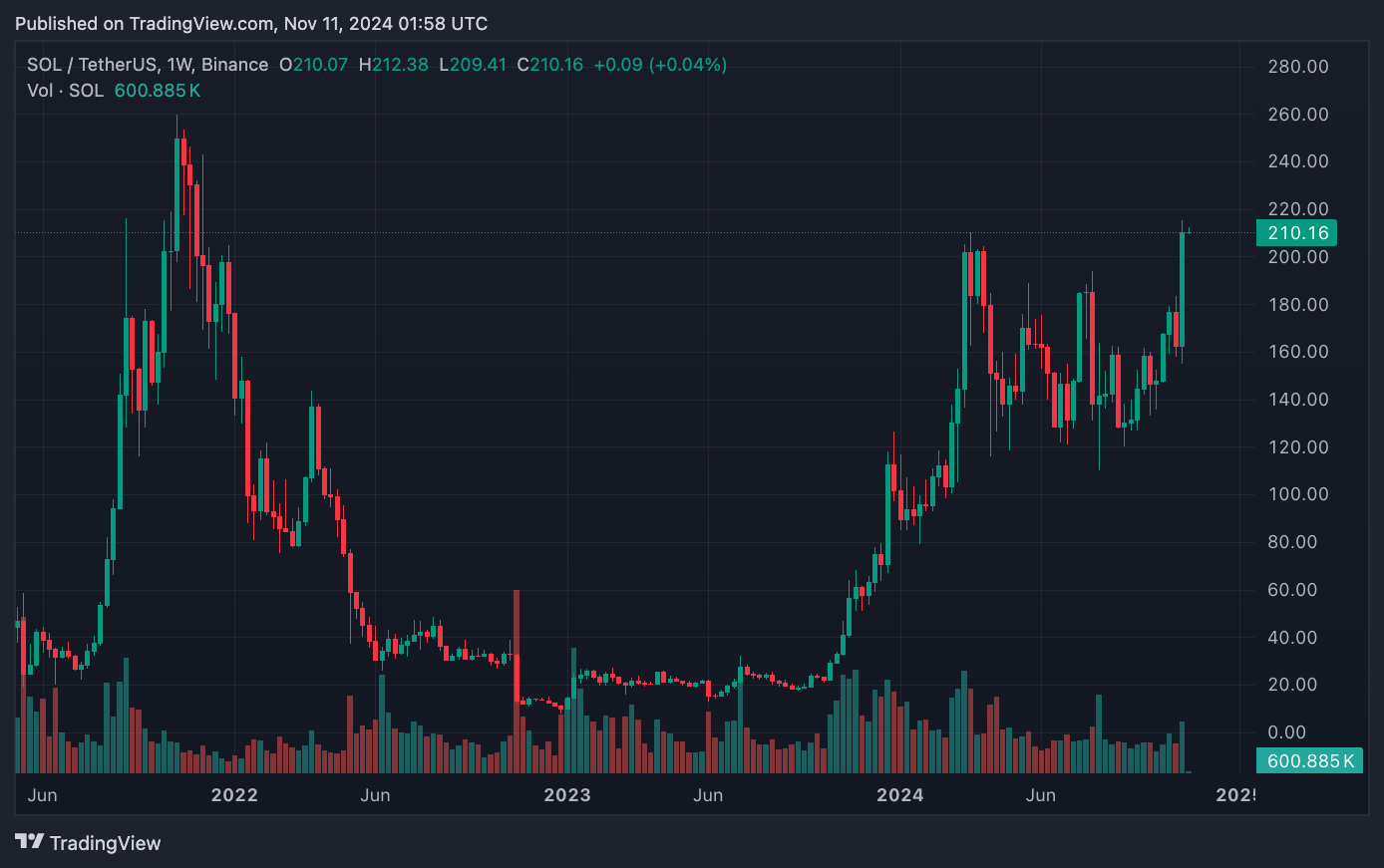 Sau cuộc bầu cử tổng thống Hoa Kỳ vào tuần trước, Solana (SOL) đã chứng kiến một đợt tăng giá mạnh mẽ, vươn lên mức 214 USD vào sáng Chủ Nhật, mức cao chưa từng thấy kể từ đợt tăng giá mạnh mẽ của SOL vào đầu năm 2021. Mặc dù giá đã điều chỉnh nhẹ xuống còn khoảng 210 USD vào thời điểm hiện tại, nhưng Solana vẫn ghi nhận mức tăng 5% trong ngày và hơn 30% trong tuần qua, nâng tổng mức tăng trong 30 ngày lên đến 44%.