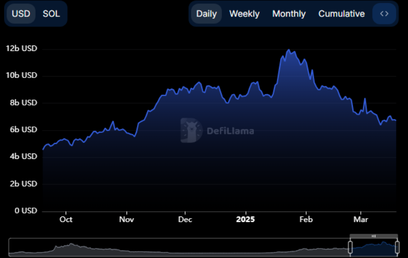 Theo dữ liệu từ DeFiLlama, tổng giá trị bị khóa (TVL) trên Solana hiện đạt 6,72 tỷ USD.