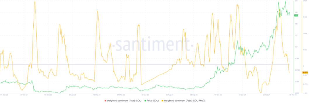 Sự bi quan ngày càng tăng của các nhà đầu tư SOL càng chứng tỏ sự thiếu lạc quan. Điều này được thể hiện rõ ràng qua chỉ số weighted sentiment. Chỉ số này cho thấy mức giảm xuống dưới 0, gợi ý tâm lý giảm giá đang chiếm ưu thế trong các nhà đầu tư.