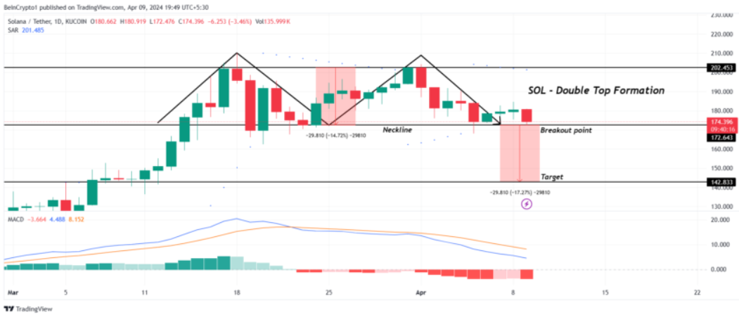 Giá Solana hiện đang giao dịch ở mức $174 và cho thấy sự hình thành của mô hình hai đỉnh tiểm năng.