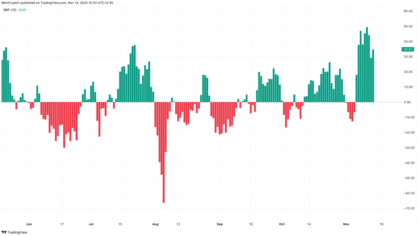 Chỉ báo BBP đánh giá sức mạnh của bên mua (bò) so với bên bán (gấu) bằng cách đo lường sự chênh lệch giữa giá cao nhất và đường EMA 13 kỳ. Khi chỉ báo nằm trên mức 0, điều này cho thấy rằng bên mua đã giữ giá trên EMA, biểu thị động lực tích cực.