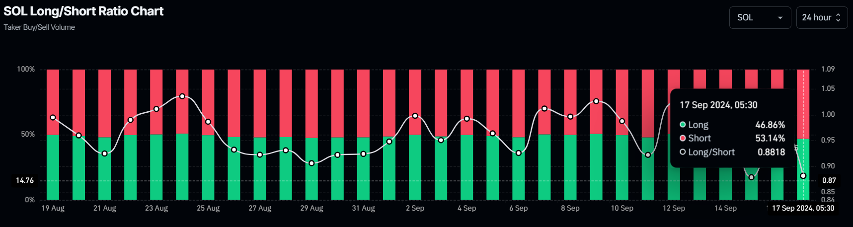 Dữ liệu từ Coinglass cũng hỗ trợ triển vọng giảm giá của Solana. Tỷ lệ long-to-short của SOL hiện là 0,88 và đã giảm xuống dưới mức một từ thứ Sáu, cho thấy nhiều trader đang dự đoán giá sẽ giảm.