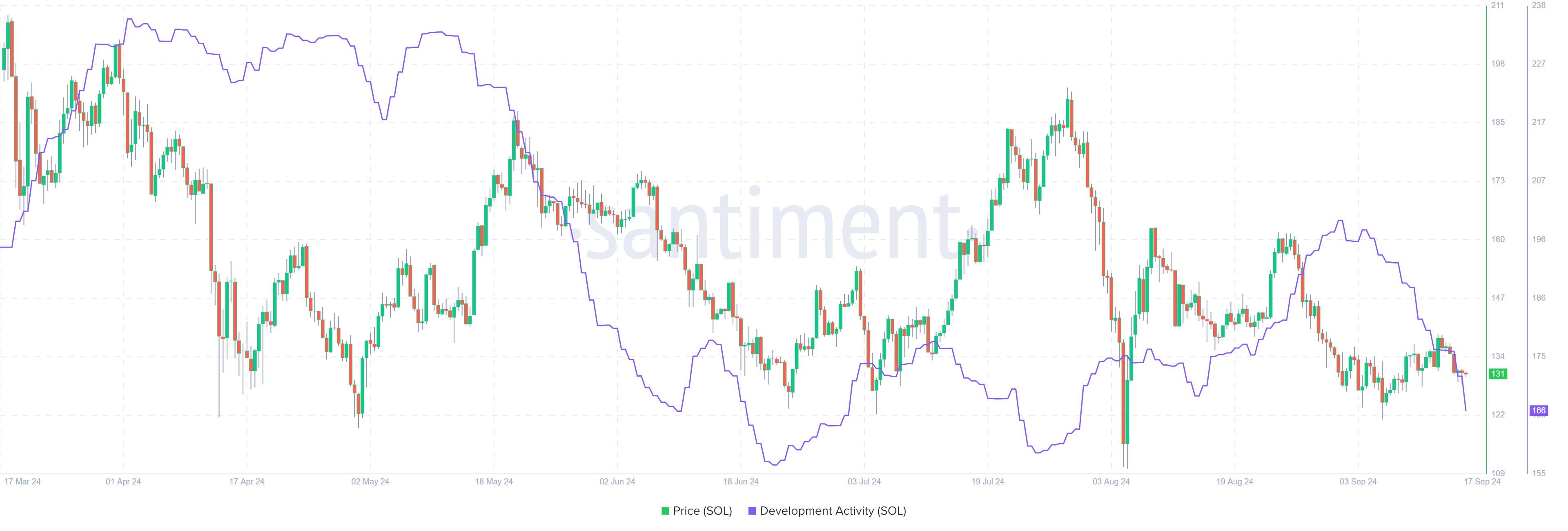 Hơn nữa, Chỉ số Hoạt động Phát triển của Santiment phản ánh sự suy yếu này. Chỉ số, theo dõi hoạt động phát triển dự án trên GitHub, đã giảm mạnh từ 176,95 vào Chủ nhật xuống còn 166 vào thứ Ba, với xu hướng giảm kể từ đầu tháng 9. Mức độ hoạt động phát triển thấp của Solana có thể làm giảm niềm tin vào các dự án blockchain của nó, từ đó ảnh hưởng tiêu cực đến tâm lý thị trường.