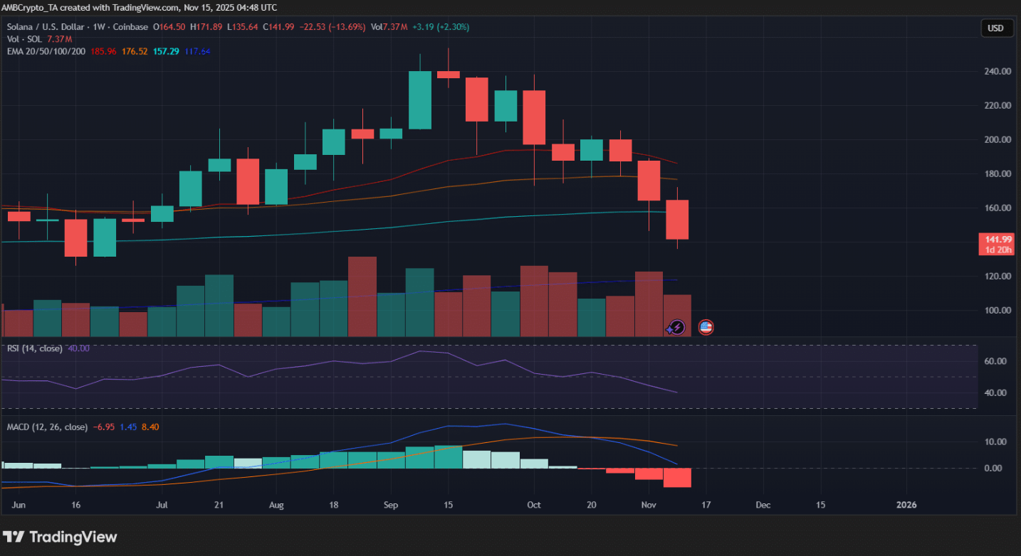 SOL đã trượt xuống dưới đường EMA 50 tuần tại 176 USD và hiện đang lùi về kiểm tra đường EMA 100 tuần quanh 157 USD — vùng giá đã không xuất hiện từ tháng 6. Khối lượng bán tăng liên tiếp trong hai tuần cho thấy áp lực chốt lời vẫn còn rất mạnh.