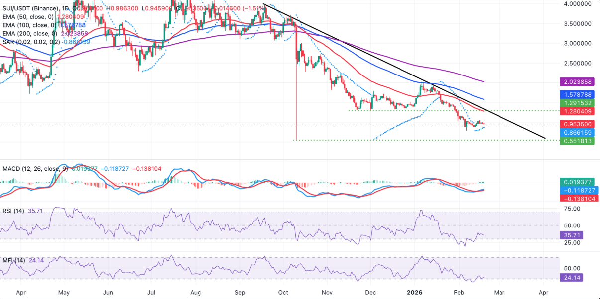 Sui (SUI) đang nối dài đà lao dốc sang phiên thứ hai liên tiếp, giao dịch quanh ngưỡng 0,95 USD tại thời điểm ghi nhận vào ngày thứ Năm. Token Layer-1 này đã mất hơn 16% giá trị trong tháng 2 và giảm xấp xỉ 34% kể từ đầu năm đến nay, phản ánh rõ nét tâm lý thận trọng, thậm chí bi quan, đang bao trùm toàn bộ thị trường tiền điện tử.