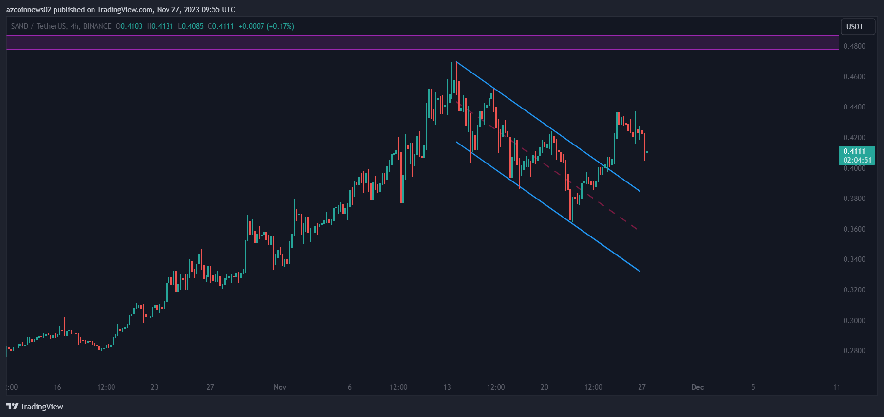 Biểu đồ 4 giờ cho thấy giá SAND đã bứt phá lên trên một kênh song song giảm dần ngắn hạn, được hình thành từ ngày 13 tháng 11.