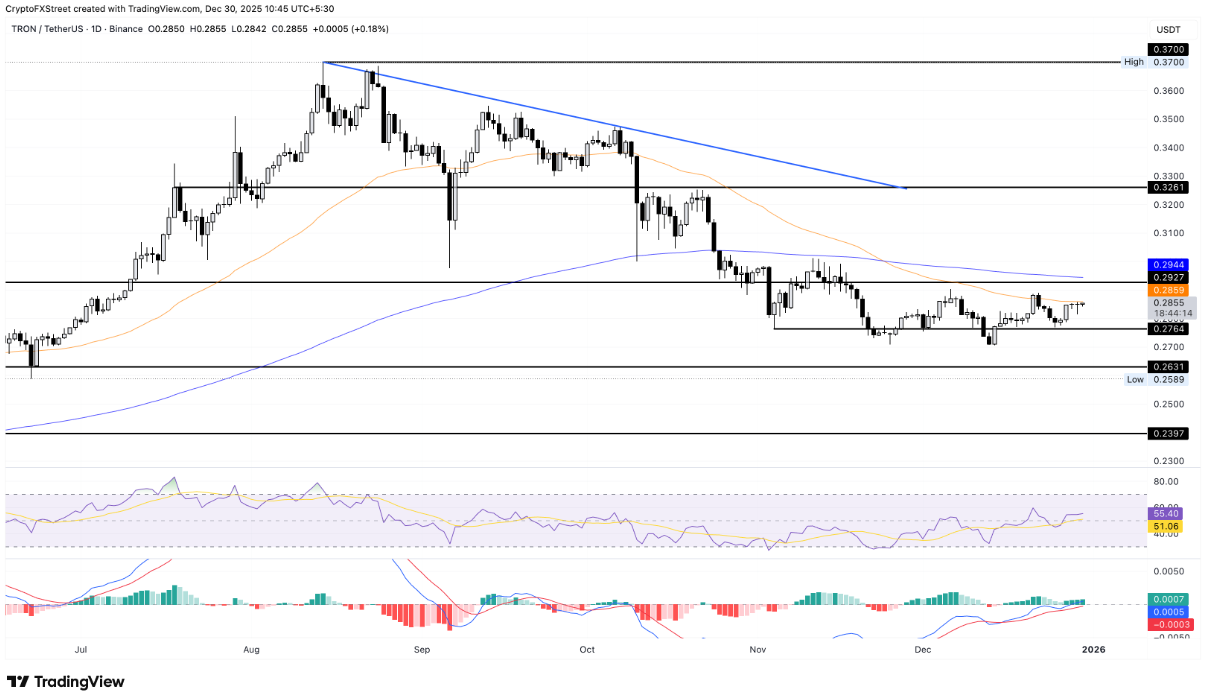 Dẫu vậy, sự xuất hiện của các cây nến thân dài hàm ý lực cầu tiềm ẩn vẫn đang âm thầm tích lũy, qua đó làm gia tăng khả năng TRX có thể bứt phá lên trên đường EMA 50 ngày trong các phiên tới. Một cú đóng cửa rõ ràng trên mốc 0,2859 USD sẽ mở ra dư địa để giá tiếp tục mở rộng đà phục hồi, hướng đến đường EMA 200 ngày tại 0,2944 USD.
