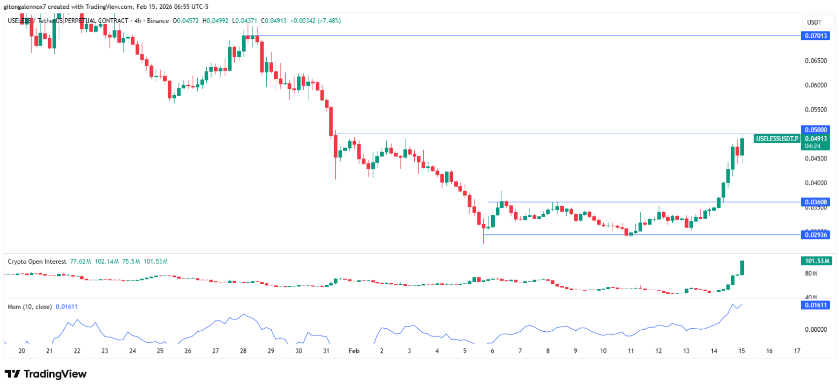 Song song với diễn biến giá, hợp đồng mở (OI) cũng ghi nhận mức tăng đáng kể. Tại thời điểm quan sát, OI đã vượt ngưỡng 100 triệu USD, cho thấy dòng tiền đầu cơ đang gia nhập mạnh mẽ, đúng lúc USELESS bước vào phép thử quan trọng quanh mốc 0,05 USD.