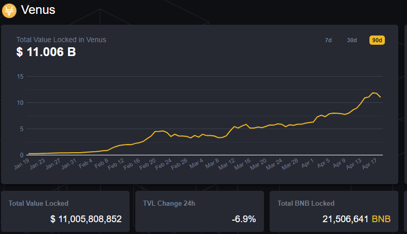 Dữ liệu từ Defistation cho thấy Venus hiện là nền tảng DeFi được xếp hạng hàng đầu trên BSC theo tổng giá trị bị khóa, với 11 tỷ đô la tài sản thế chấp hiện được gửi trên giao thức.