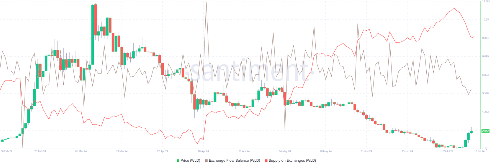 Dữ liệu on-chain cho thấy số lượng địa chỉ hoạt động hàng ngày của WLD đang tăng lên, báo hiệu sự gia tăng sử dụng blockchain. Chỉ số cân bằng dòng tiền sàn giao dịch tiết lộ rằng token WLD đang rời khỏi các sàn giao dịch và Nguồn cung trên sàn giao dịch đang giảm, tất cả đều chỉ ra rằng WLD có thể tăng giá hơn nữa trong những ngày tới.