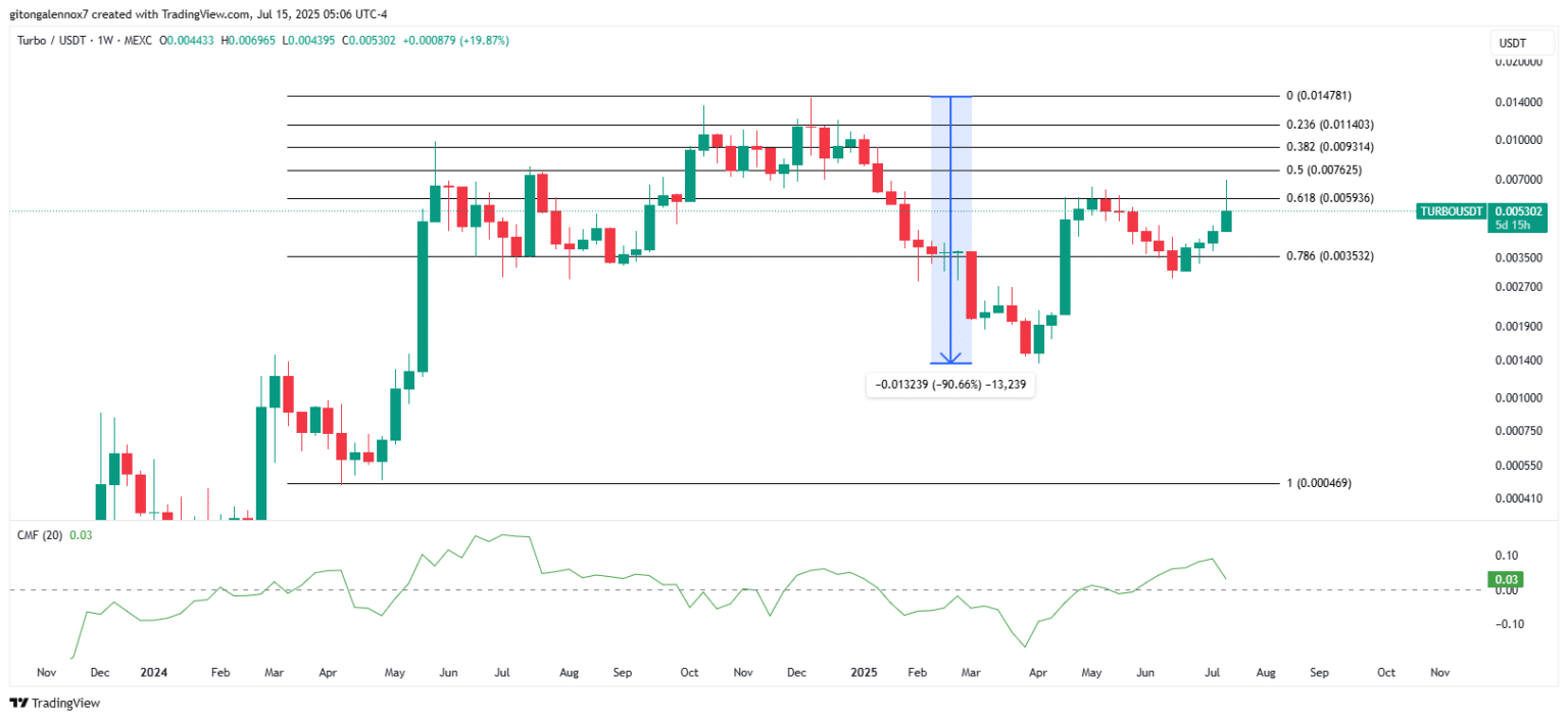 Tuy nhiên, để duy trì đà tăng này, TURBO phải giữ giá trên ngưỡng Fib thoái lui 0,618 gần $0,006.