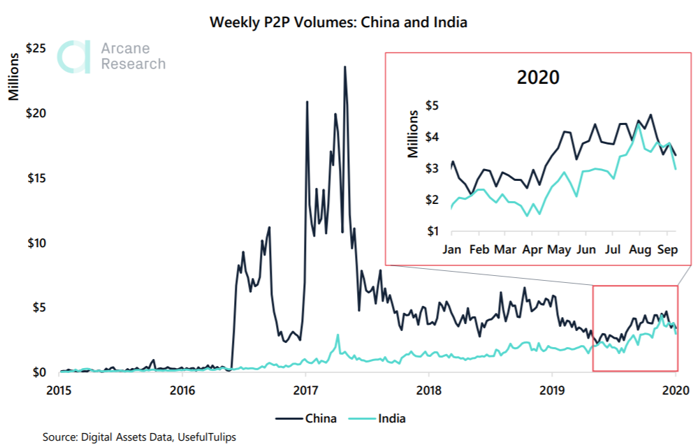 Thị trường P2P đã chứng kiến khối lượng lớn vào năm 2020 và Paxful đã trở thành sàn giao dịch hàng đầu với khối lượng ngày càng tăng ở nhiều khu vực. Người dùng P2P ở Trung Quốc đã dẫn đầu khu vực châu Á – Thái Bình Dương trong một thời gian dài, nhưng kể từ năm 2020 đã thay đổi cách thức hoạt động của thế giới, điều đó cũng phản ánh lượng người dùng P2P ngày càng tăng ở Ấn Độ. Giá trị đã vượt qua Trung Quốc và vẫn tiếp tục tăng, theo gợi ý của dữ liệu do Arcane Research báo cáo.