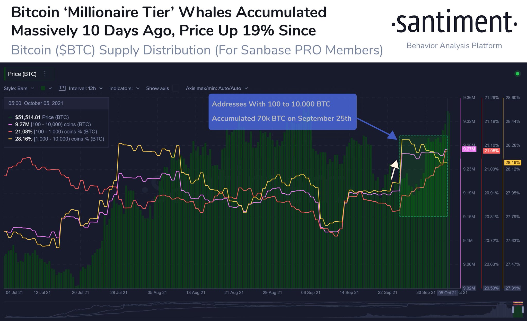 Santiment cho biết các trader cá voi gần đây đã tích lũy lượng BTC một ngày lớn nhất trong hơn 2 năm. Những cá voi này cũng không bán, khiến công ty phân tích tin rằng đây là động lực đẩy BTC trở lại trên 51.000 đô la.