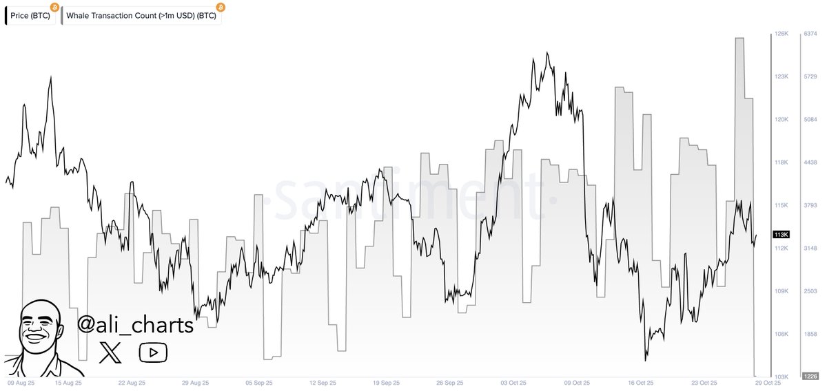 Hoạt động của các “cá voi” Bitcoin đang tăng mạnh khi có hơn 6.311 giao dịch lớn được ghi nhận chỉ trong vòng một tuần, theo dữ liệu từ Santiment do nhà phân tích Ali Martinez chia sẻ.