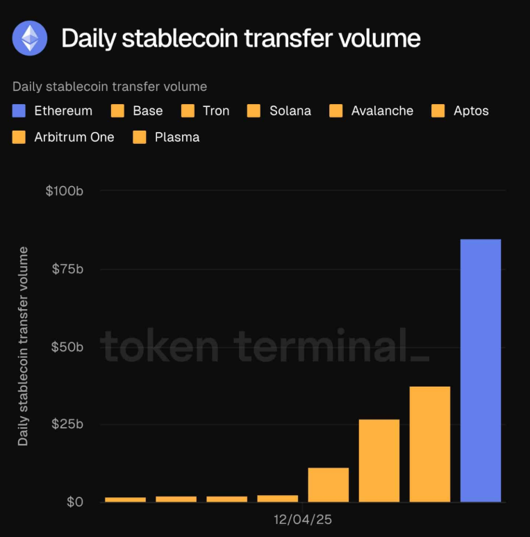 Ethereum (ETH) đang bứt phá mạnh mẽ nhờ mức độ sử dụng ngày càng tăng. Khối lượng chuyển Stablecoin hàng ngày đã vượt ngưỡng 85 tỷ USD, bỏ xa mọi blockchain khác trên thị trường.
