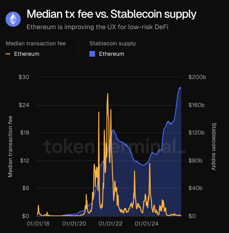 Đà tăng này phản ánh một xu hướng lớn hơn: phí giao dịch trung bình trên Ethereum gần như giảm về mức bằng 0, trong khi nguồn cung Stablecoin trên mạng lưới đã vượt 180 tỷ USD. Môi trường chi phí thấp cùng thanh khoản dồi dào đã đẩy tốc độ luân chuyển vốn trên Ethereum lên đỉnh cao lịch sử, đặc biệt nổi bật trong các lĩnh vực DeFi an toàn, ít rủi ro.